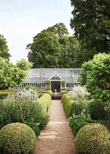 Chrissie’s enormous walled garden in Buckinghamshire incorporates a strict color code of green and white limiting her plant option. Most of the garden has acanthus and Hydrangea arborescens ‘Annabelle’ (also known as smooth hydrangea), as well as silvery-white Allium stipitatum ‘Mount Everest’ and fresh daisy-like marguerites. To achieve the desired look, only white phlox, valerian, and sedum plants were used!